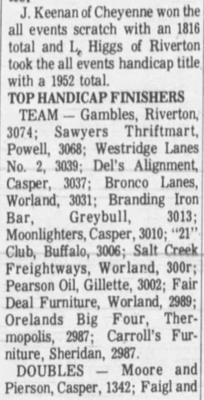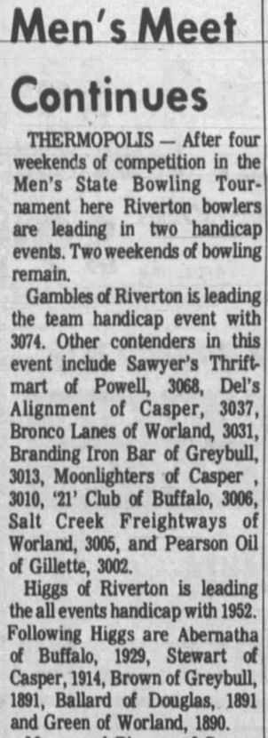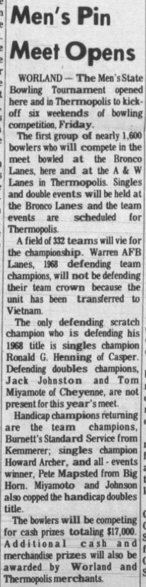 The 21st Annual Wyoming Men's State Bowling Tournament held the Team Event at A&W Drive-In Bowling Lanes in Thermopolis in conjunction with the Doubles & Singles Event at Bronco Lanes in Worland, Wyoming.