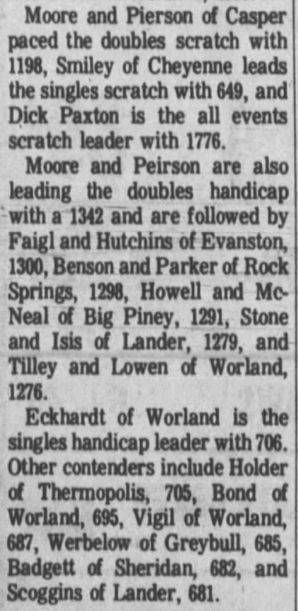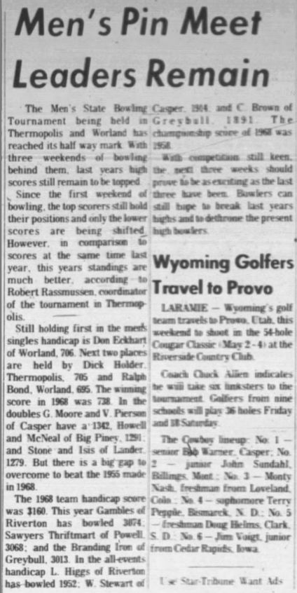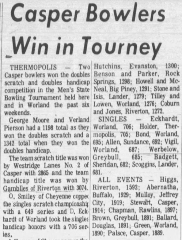 The tournament ran from April 11th through May 11th, 1969. The Scratch Singles was won by Orval Smiley from Cheyenne with a 649. The Scratch Doubles was won by George Moore and Verland Pierson from Casper with a 1198. The Scratch Team was won by Westridge Lanes No. 2 from Casper with a 2865. The Scratch All Events was won by Jim Keenan from Cheyenne with a 1816. The Handicap Singles was won by Ron Eckhardt from Worland with a 706. The Handicap Doubles was won by George Moore and Verland Pierson from Casper with a 1342. The Handicap Team was won by Gambles from Riverton with a 3074. The Handicap All Events was won by L. Higgs from Riverton with a 1952. Low to cash figures were: Scratch teams (2730), Handicap teams (2917), Scratch doubles (1171), Handicap doubles (1200), Scratch singles (613), Handicap singles (618), and 1831 in Handicap all-events. |