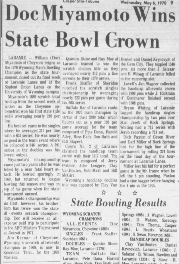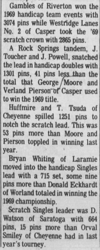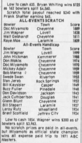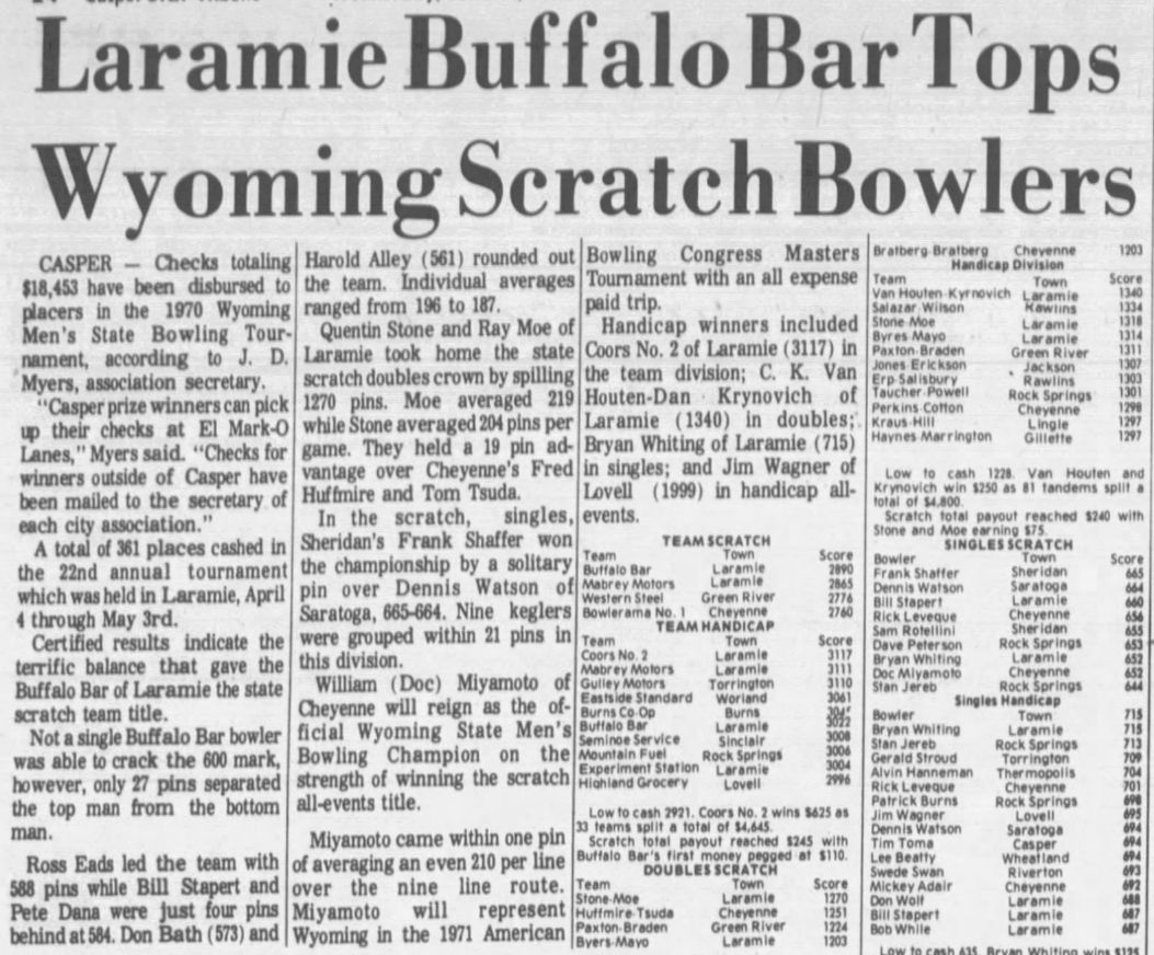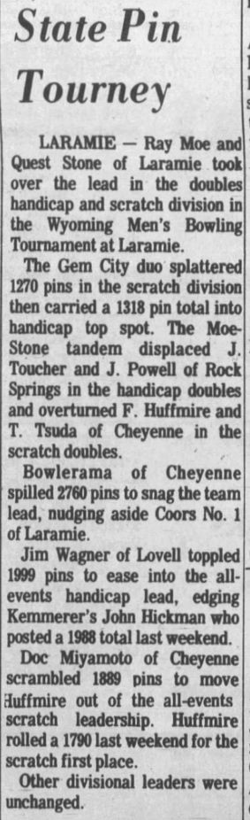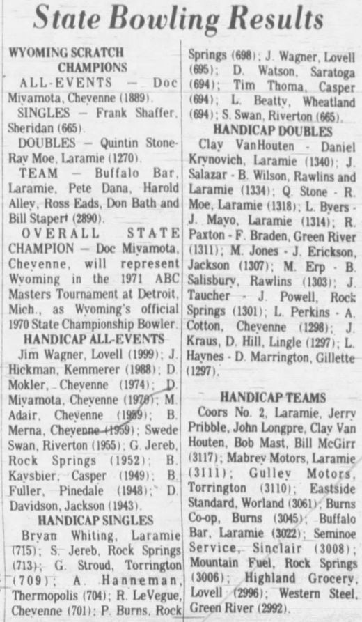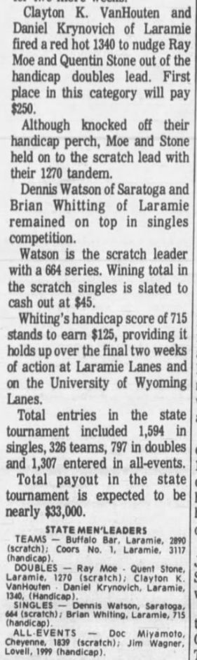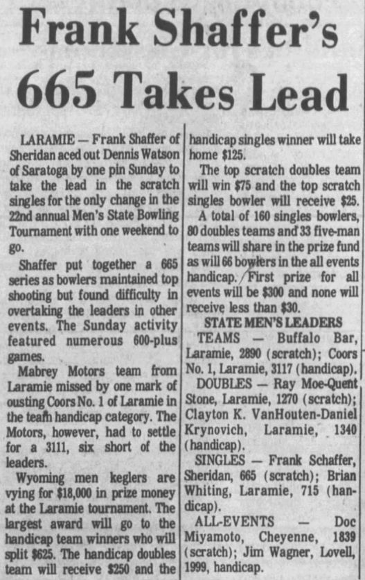 The Scratch Singles was won by Frank Shaffer from Sheridan with a 665. The Scratch Doubles was won by Quintin Stone and Ray Moe from Laramie with a 1270. The Scratch Team was won by Buffalo Bar from Laramie with a 2890. The Scratch All Events was won by Doc Miyamoto from Cheyenne with a 1889. The Handicap Singles was won by Bryan Whiting from Laramie with a 715. The Handicap Doubles was won by Clay VanHouten and Daniel Krynovich from Laramie with a 1340. The Handicap Team was won by Coors No. 2 from Laramie with a 3117. The Handicap All Events was won by Jim Wagner from Lovell with a 1999. Low to cash figures were: Handicap teams (2915), Handicap doubles (1221), Handicap singles (633), and 1837 in Handicap all-events. |