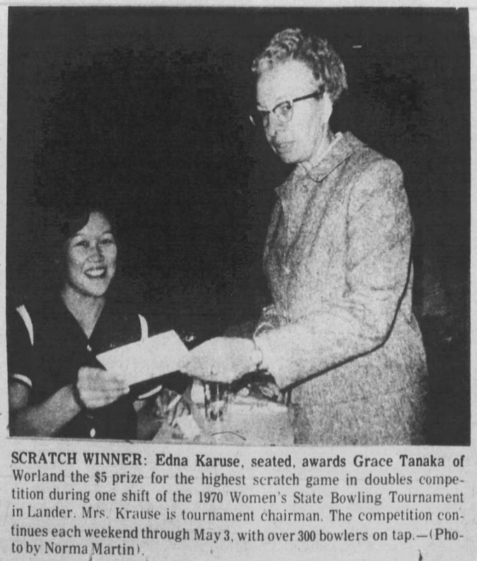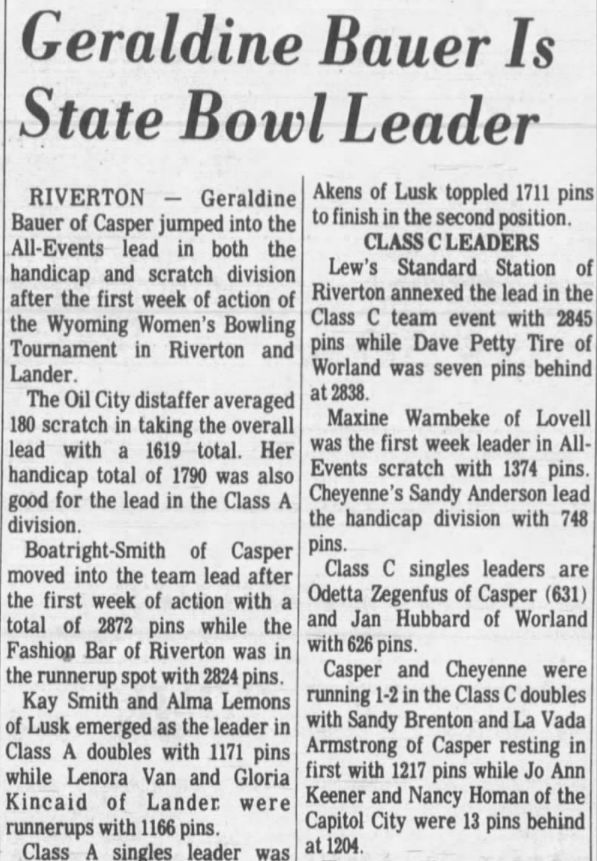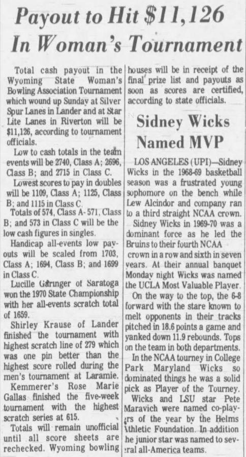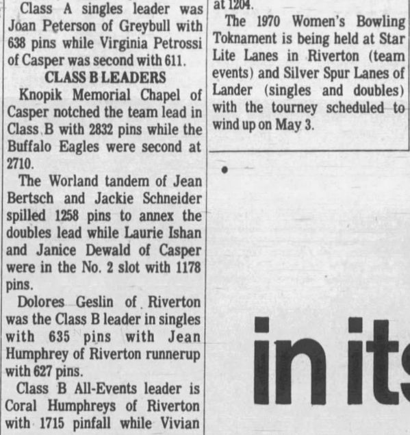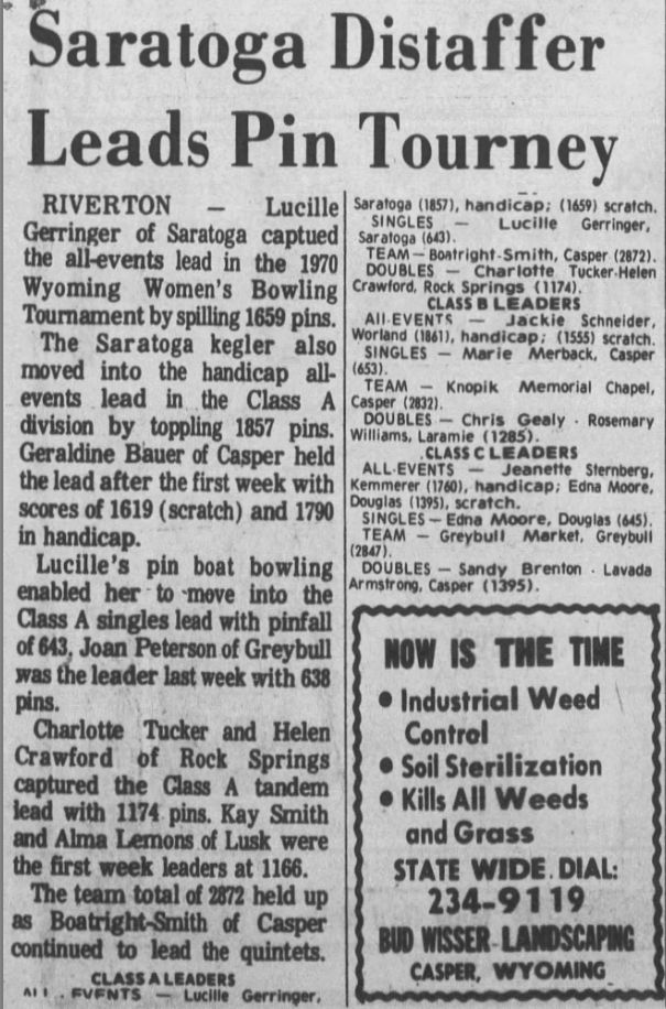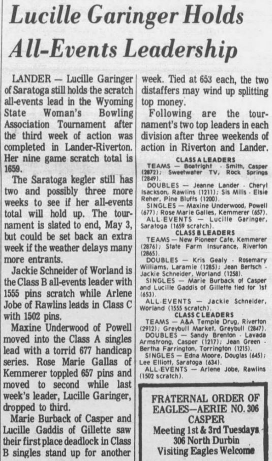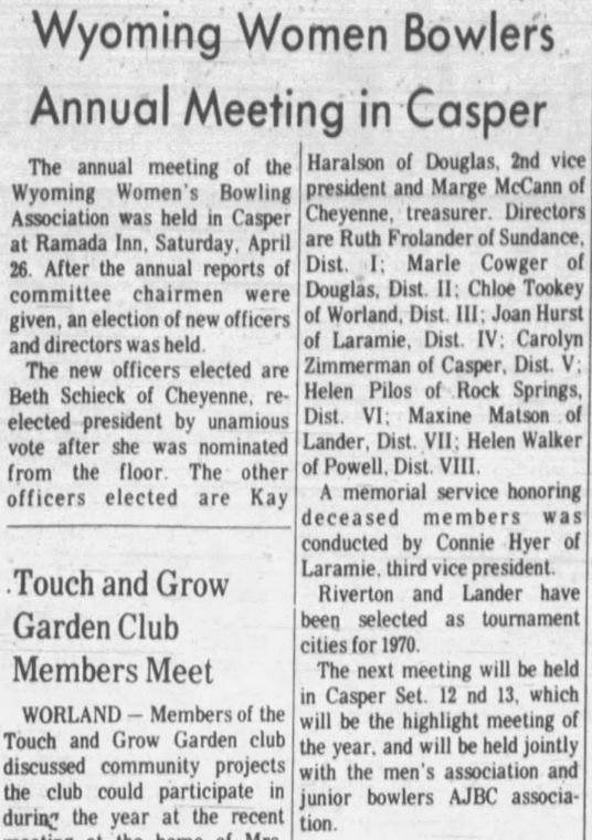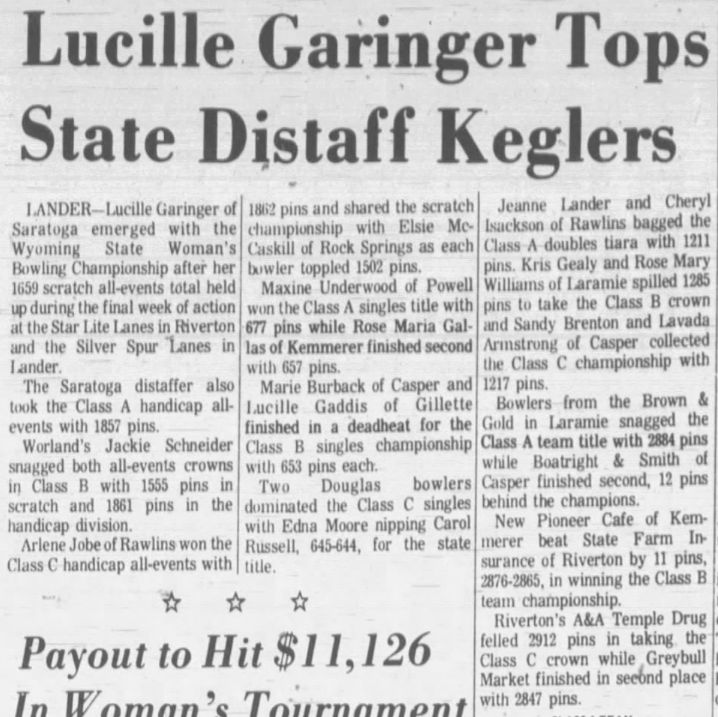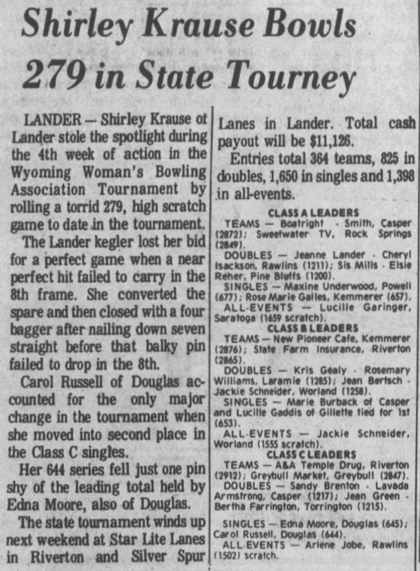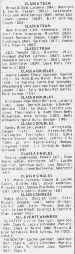 The tournament ran from April 4th through May 3rd, 1970. The Class A Singles was won by Maxine Underwood from Powell with a 677. The Class B Singles was was a tie between Marie Burback from Casper and Lucille Gaddis from Gillette with a 653. The Class C Singles was won by Edna Moore from Douglas with a 645. The Class A Doubles was won by Jeanne Lander and Cheryl Isackson from Rawlins with a 1211. The Class B Doubles was won by Kris Gealy and Rose Marie Williams from Laramie with a 1285. The Class C Doubles was won by Sandy Brenton and Lavada Armstrong from Casper with a 1217. The Class A Team was won by Brown & Gold from Laramie with a 2884. The Class B Team was won by New Pioneer Cafe from Kemmerer with a 2876. The Class C Team was won by A&A Temple Drug from Riverton with a 2912. The Class A Scratch All Events was won by Lucille Garinger from Saratoga with a 1659. The Class B Scratch All Events was won by Jackie Schneider from Worland with a 1555. The Class C Scratch All Events was a tie between Arlene Jobe from Rawlins and Elsie McCaskill from Rock Springs with a 1502. The Class A Handicap All Events was won by Lucille Garinger from Saratoga with a 1857. The Class B Handicap All Events was won by Jackie Schneider from Worland with a 1861. The Class C Handicap All Events was won by Arlene Jobe from Rawlins with a 1862. The High Scratch Game was won by Shirley Krause from Lander with a 279. Low to cash figures were: Class A team (2740), Class B team (2696), Class C team (2715), Class A doubles (1109), Class B doubles (1125), Class C doubles (1115), Class A singles (574), Class B singles (571), Class C singles (573), Class A all-events (1703), Class B all-events (1694) and Class C all-events (1699). |
